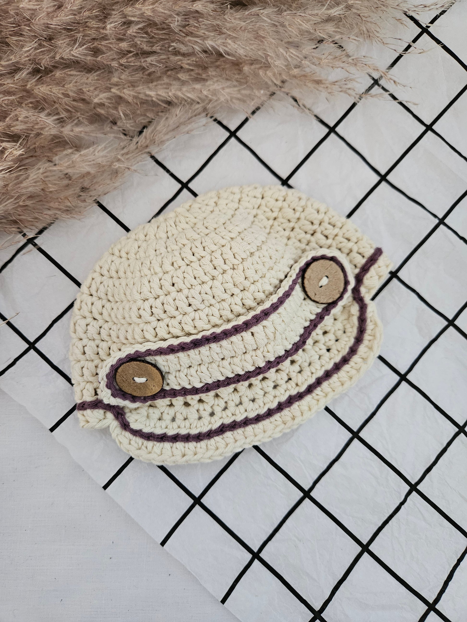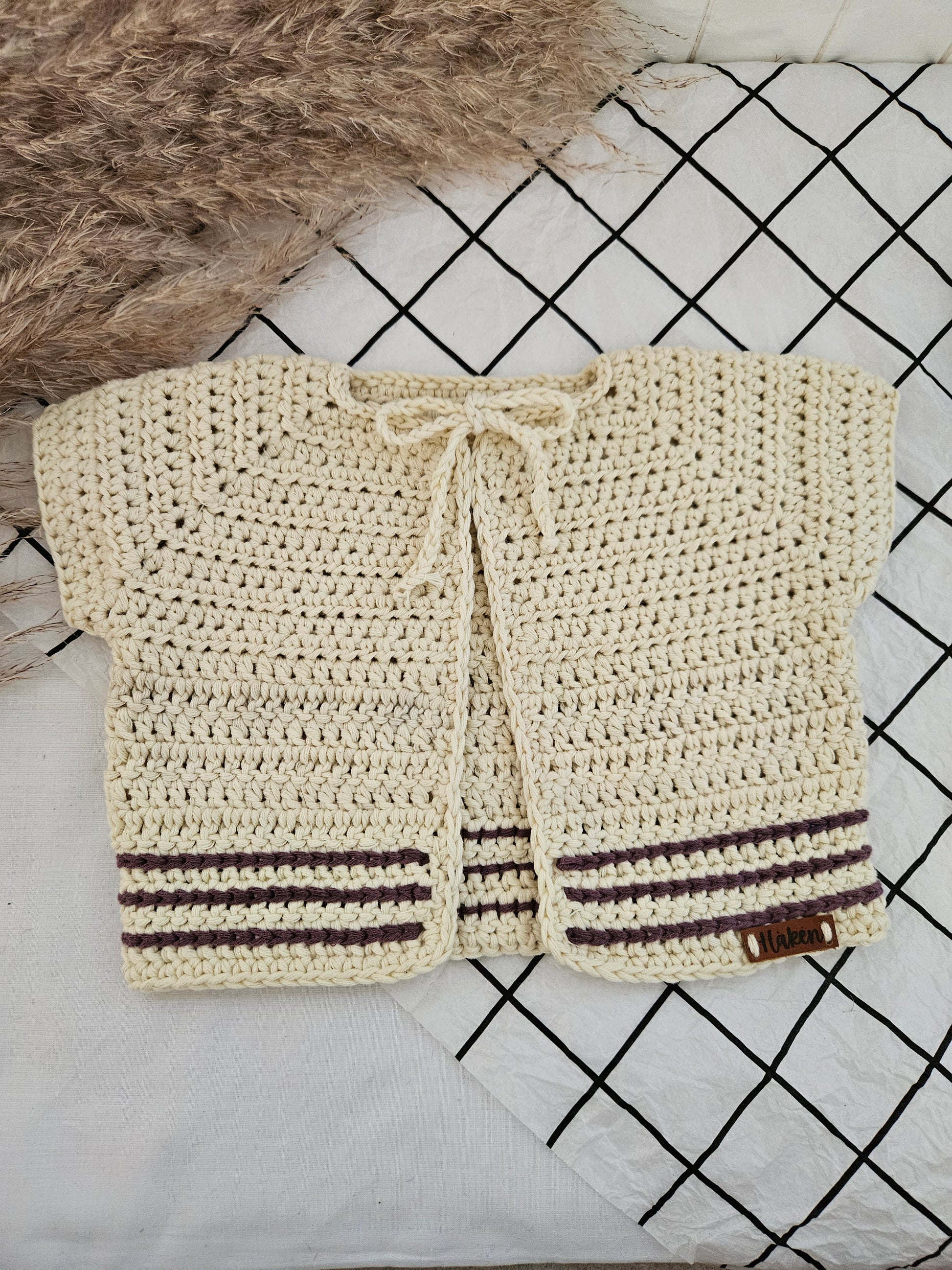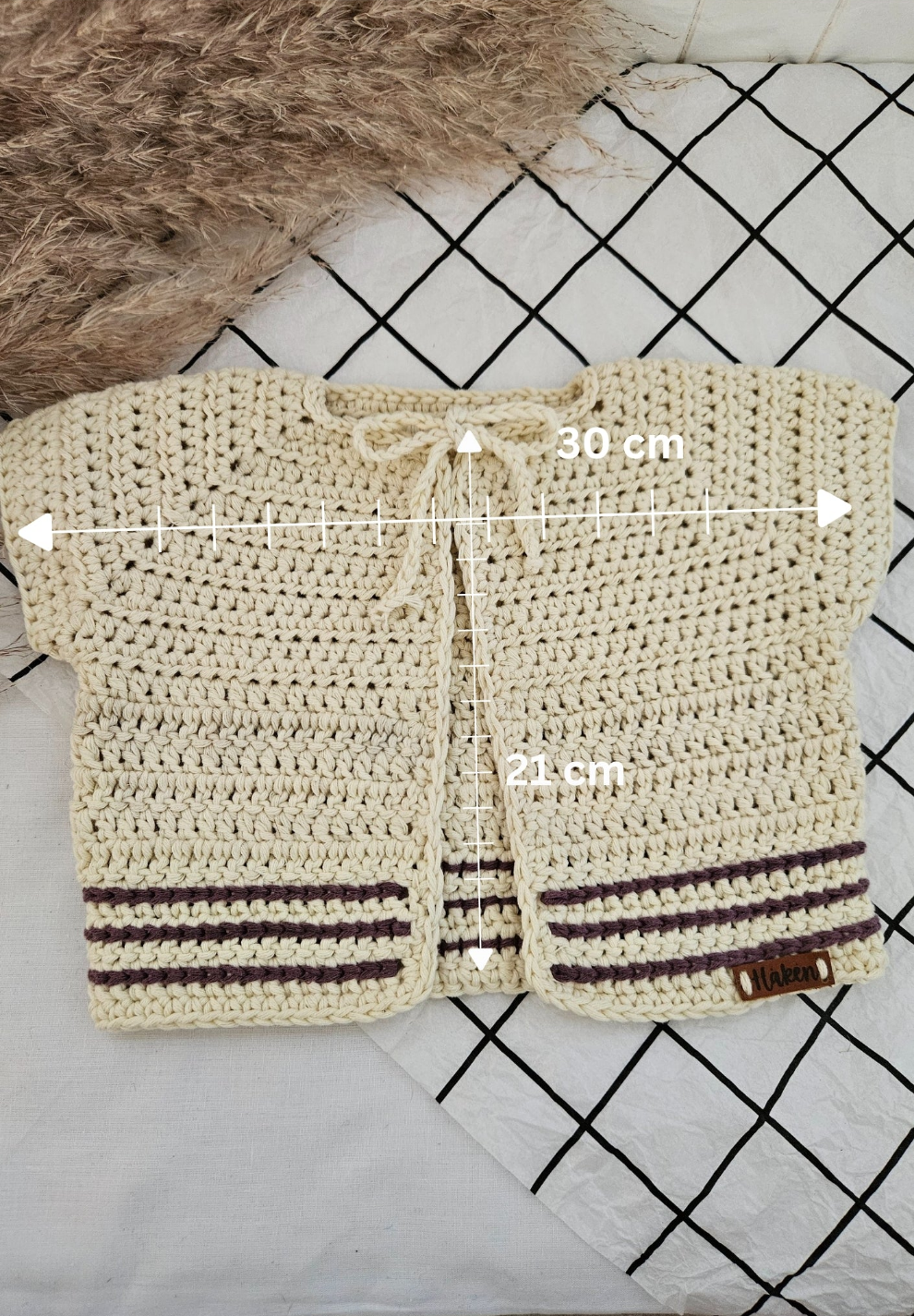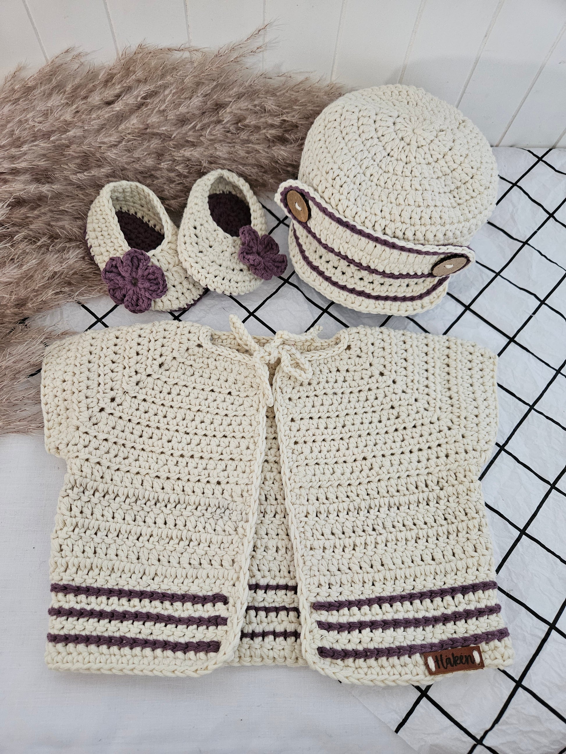 This stylish summer set features a lightweight crochet cardigan for a 3 - 6 month old, comfortable shoes, and a chic hat, all crafted from 100% cotton for breathability. The off-white base is beautifully accented with delicate purple stitches, adding a touch of elegance and charm. Perfect for warm days, this ensemble combines comfort and fashion effortlessly.