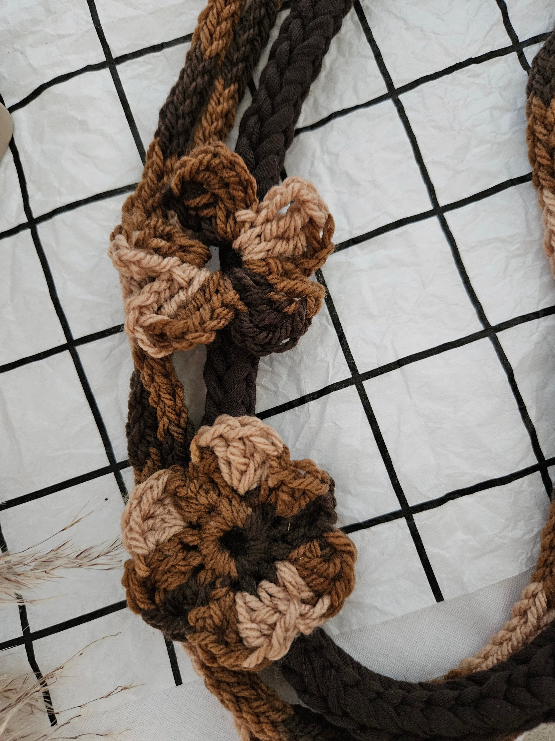 This chocolate brown crochet necklace showcases a beautiful, handcrafted design adorned with two delicate crochet flowers. The warm, earthy tones add a touch of elegance and charm, making it a perfect accessory for any outfit. Lightweight and versatile, it effortlessly enhances your style with a unique, artistic flair.
