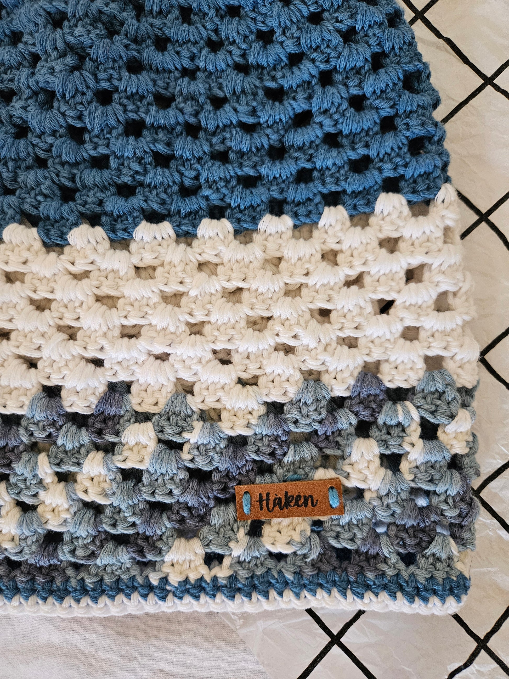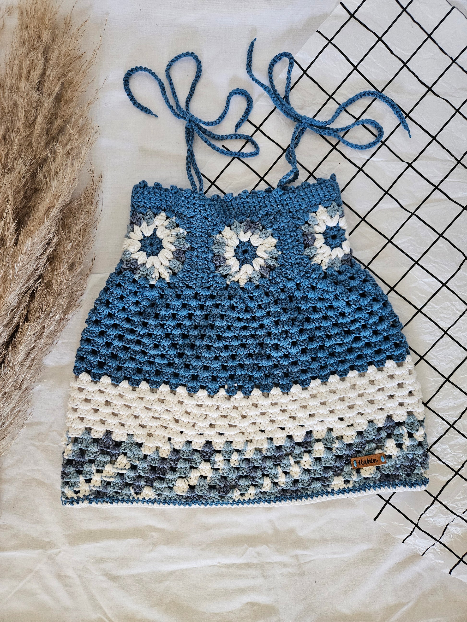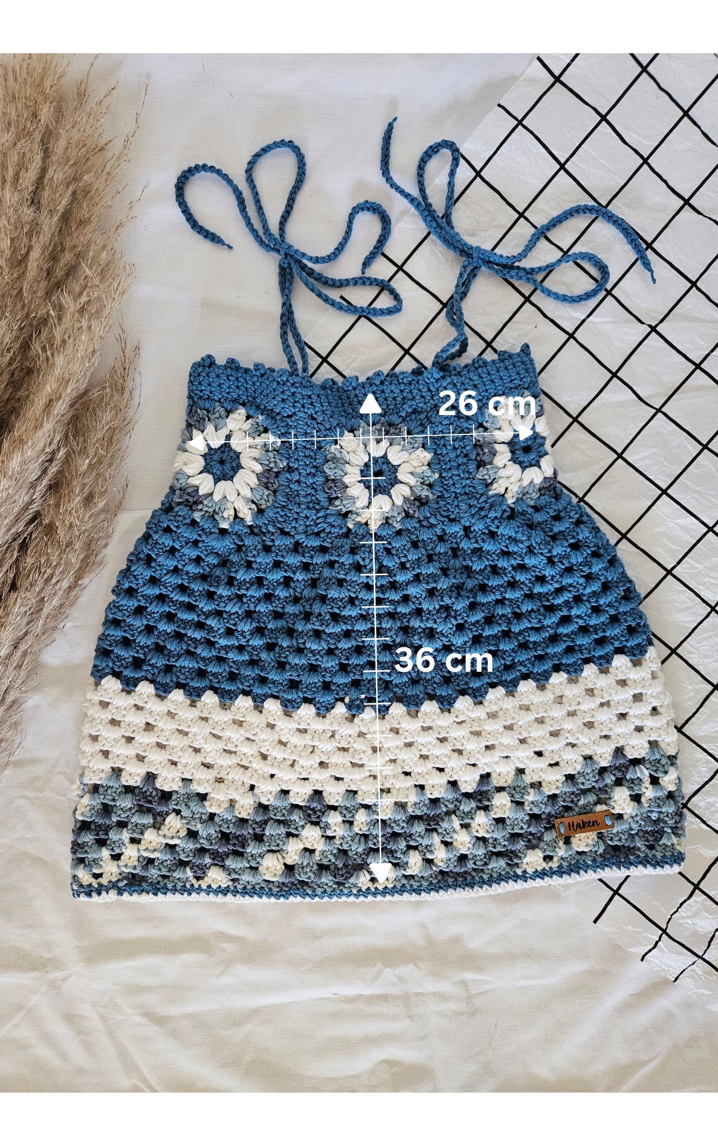 This adorable summer dress is made from 100% cotton and designed for little ones aged 6 months to a year or small toddlers. The top features a series of small granny squares, while the skirt is made from a single large granny square. The dress ties at the shoulders with a sweet bow, offering a comfortable and stylish look for warm days.