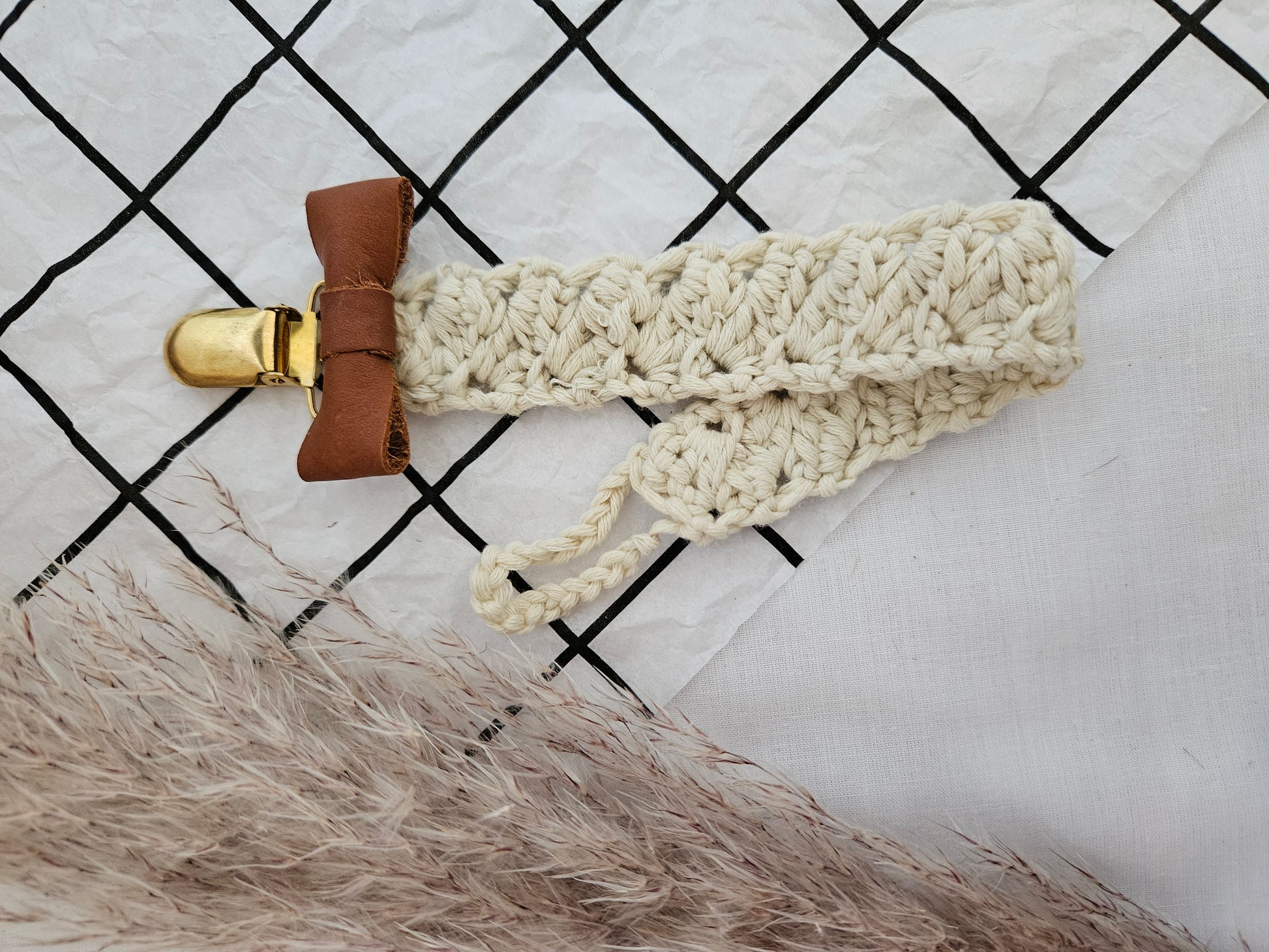 This charming crochet dummy clip features a delicate leather bow, combining functionality with style. Made from high-quality materials, it securely holds pacifiers while adding a touch of elegance to your baby's accessories. Ideal for keeping pacifiers within reach and preventing them from getting lost or dropped. Perfect for parents who appreciate both practicality and aesthetic appeal.