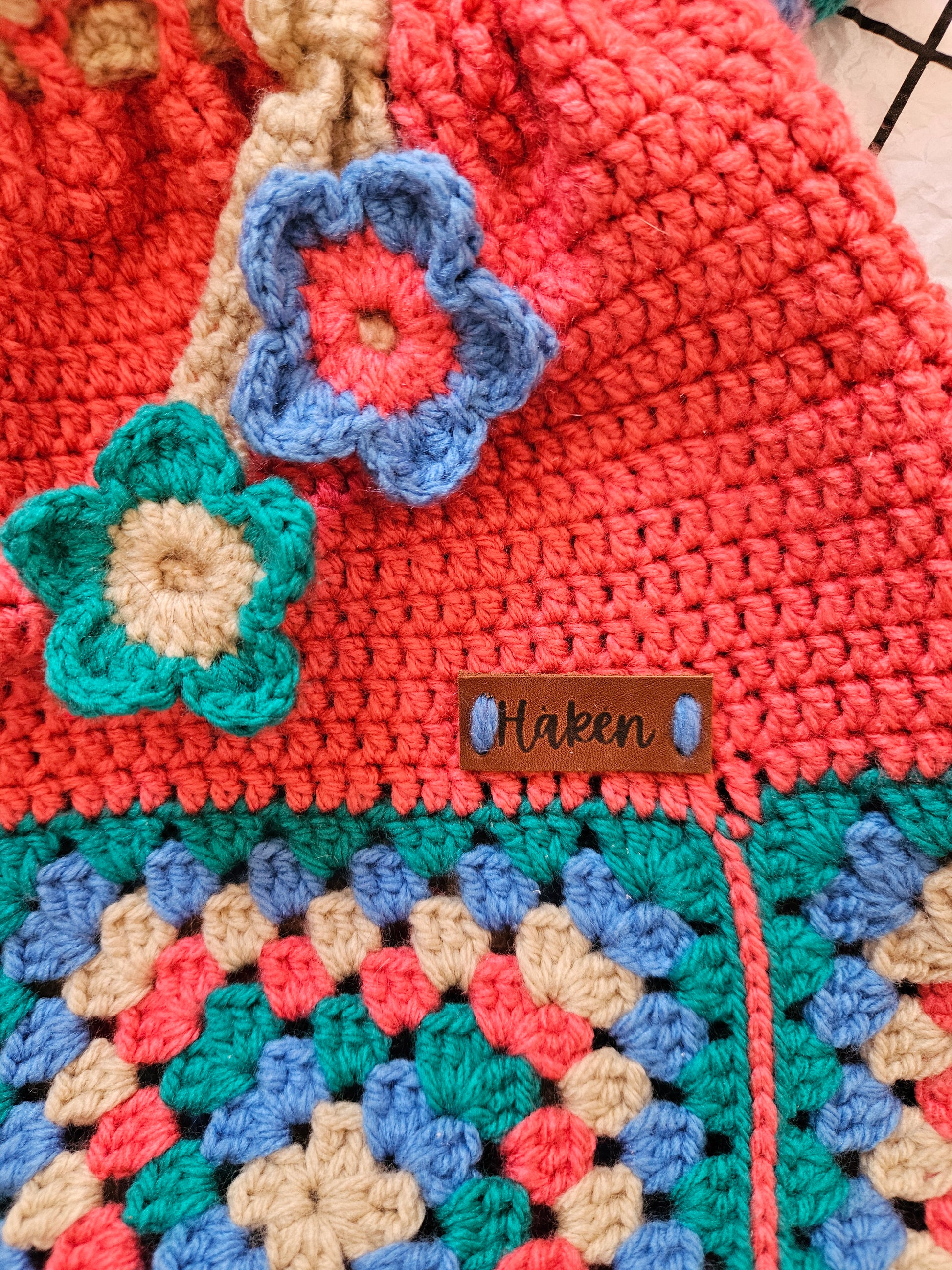 This stylish crochet handbag measures 28 cm wide and 36 cm long, showcasing a unique blend of colorful granny squares and classic crochet patterns. Perfect for adding a touch of handmade charm to your wardrobe, it combines vintage appeal with modern functionality, making it a standout accessory for any occasion.