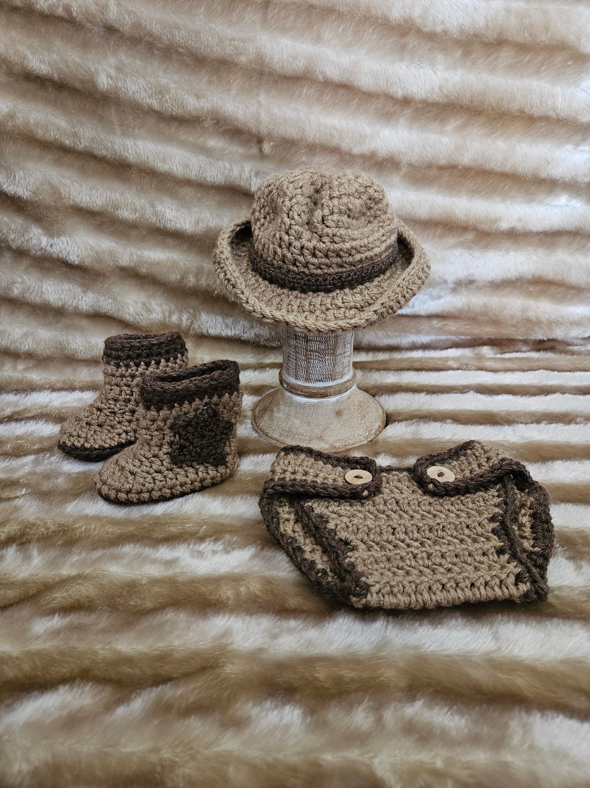 This adorable crochet cowboy outfit for a newborn features a classic cowboy hat with a charming wide brim, paired with matching crochet boots that showcase delightful Western details. The cozy bloomer completes the look, ensuring comfort while adding a playful touch. Perfect for capturing those sweet, adventurous moments in a photoshoot!